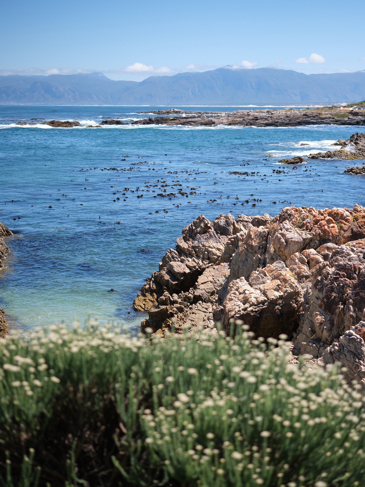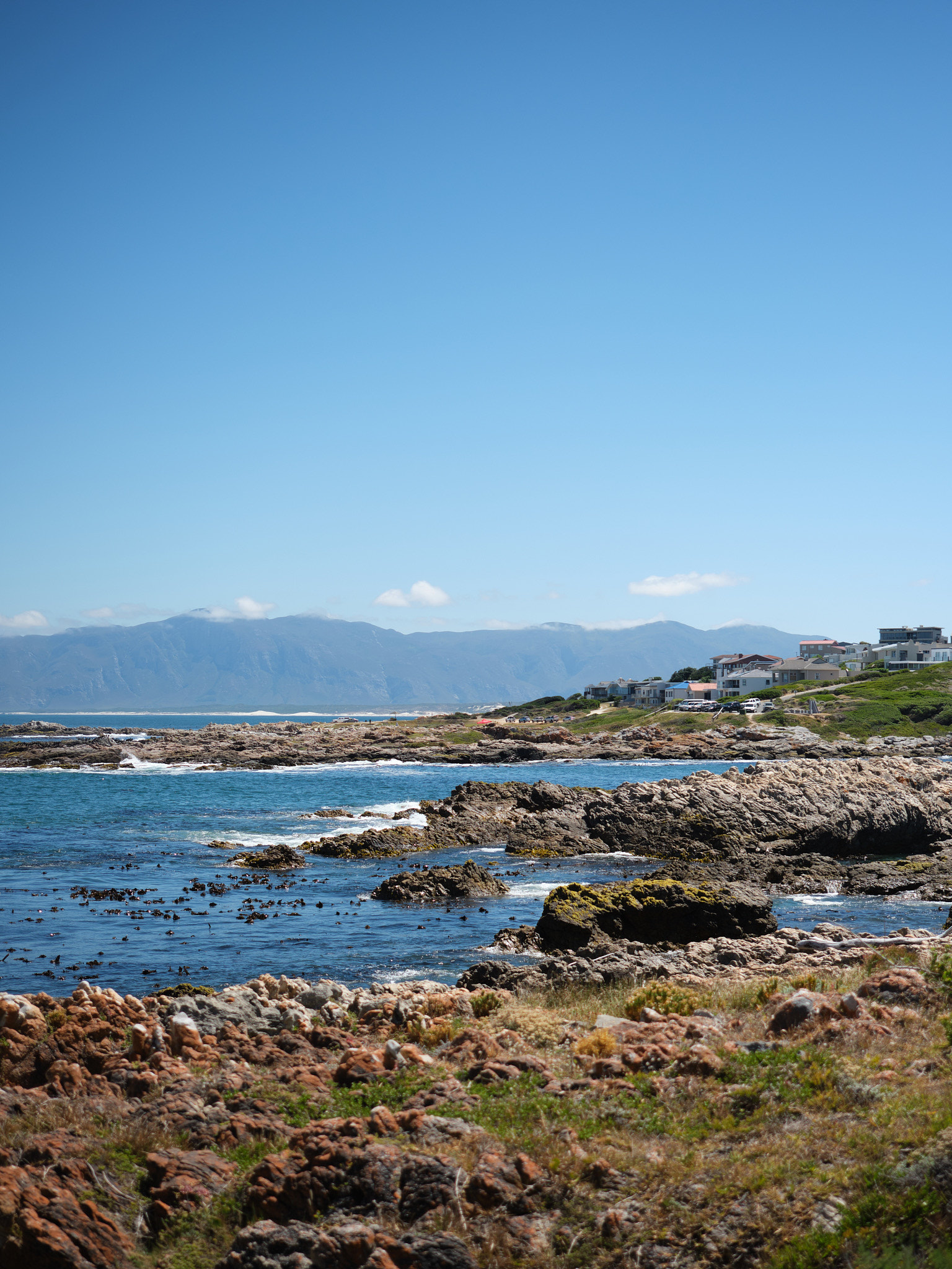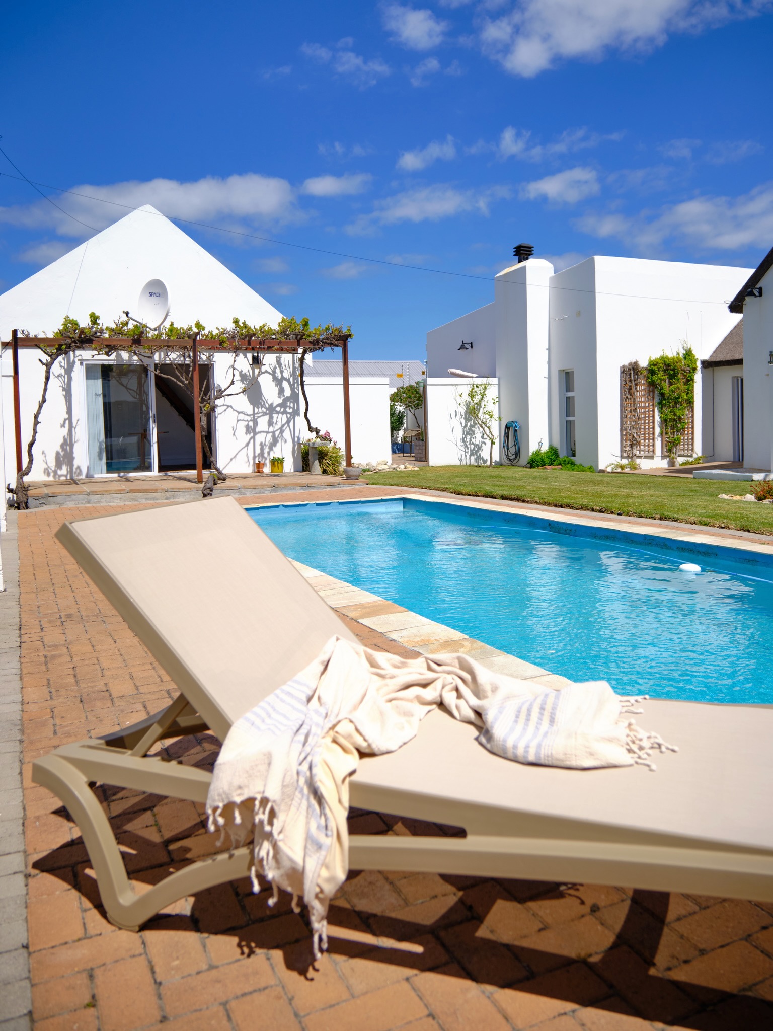 Perched precariously on a small rise overlooking Gansbaai Harbour, you’ll find our beautiful house. From the garden and pool, you can enjoy stunning views of the Walker Bay and the majestic Hottentots Holland mountains painting the horizon in the distance. In good weather you can even see the Cape of Good Hope!